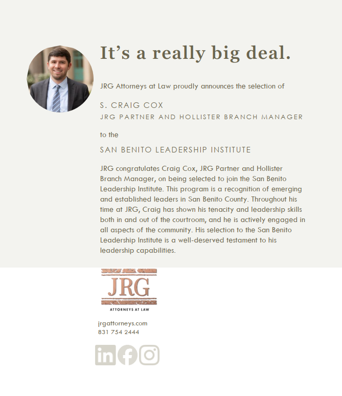 JRG congratulates Craig Cox, JRG Partner and Hollister Branch Manager, on being selected to join the San Benito Leadership Institute. This program is a recognition of emerging and established leaders in San Benito County. Throughout his time at JRG, Craig has shown his tenacity and leadership skills both in and out of the courtroom, and he is actively engaged in all aspects of the community. His selection to the San Benito Leadership Institute is a well-deserved testament to his leadership capabilities.